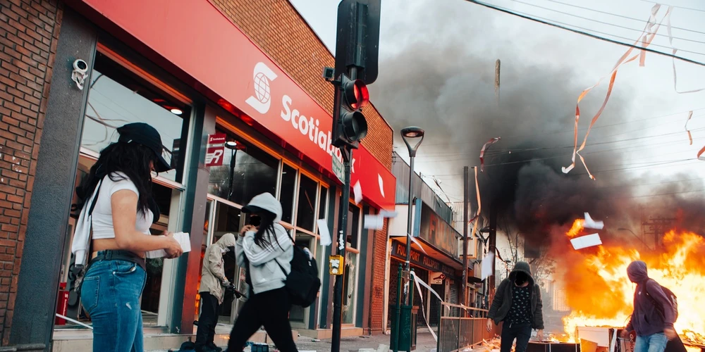 “[…] Le avvisaglie di agitazione del comparto industriale sono state rimosse da una serie di riot finora in gran parte limitati ai livelli più effimeri della circolazione – ai corridoi delle downtown, ai grandi magazzini che fungono da camera di compensazione finale per le merci, o ai simboli tradizionali del governo, dal municipio alla Casa Bianca, che sono sempre serviti come sale di potere spoglie e che, anche se se espropriate e saccheggiate, alla fine si rivelano vuote. Questa ribellione, formata da molti disordini e da molti atti di mutuo soccorso, ha iniziato a incontrare lo stesso limite con cui tutte le rivolte o le attività di mutuo soccorso alla fine si scontrano. Ha sbattuto contro il “piano di vetro” che la separa da quell’apparato produttivo reso così visibile dalla pandemia…”
