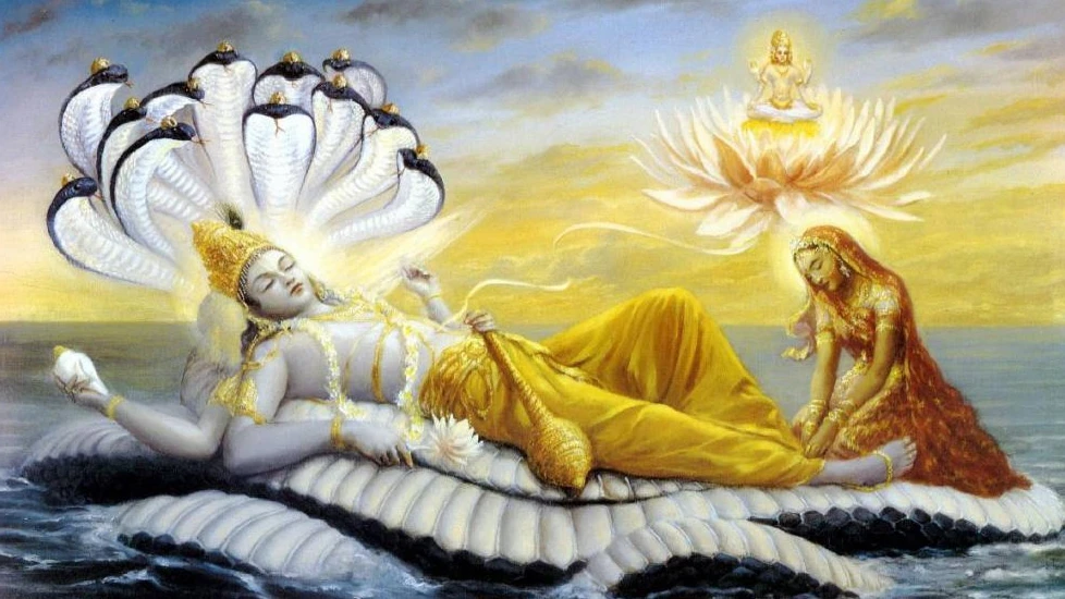 Nella mitologia indù il simbolo dello yoga nidra è il Signore Narayana che riposa sull’oceano di latte. È sdraiato su un grande serpente con molte teste e la bella Lakshmi sta massaggiando i suoi piedi. Dal suo ombelico fiorisce un fiore di loto e lì siede, nel pericarpo, il Signore Brahma, simbolo dell’inconscio. Nello yoga nidra, il tuo inconscio si manifesta: il Signore Narayana è a riposo; la tua coperta è il serpente e il pavimento è l’oceano di latte.