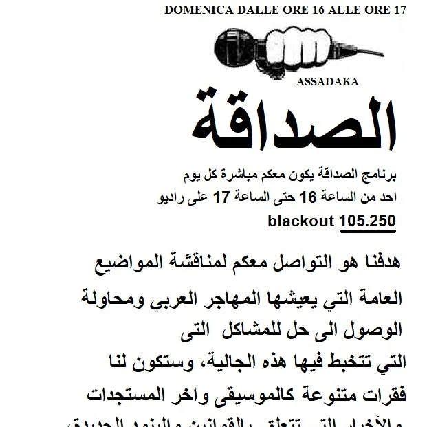 Il programma ‘Assadaka ~ Amicizia’ sarà con voi in diretta ogni domenica dalle 15.00 alle 17 00 sulle libere frequenze di radio blackout 105.250