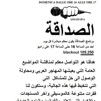 Il programma ‘Assadaka ~ Amicizia’ sarà con voi in diretta ogni domenica dalle 15.00 alle 17 00 sulle libere frequenze di radio blackout 105.250 Il nostro obiettivo è quello di comunicare con il pubblico per discutere i temi generali degli immigrati arabi per cercare di raggiungere insieme una soluzione ai problemi. Durante la trasmissione tra […]