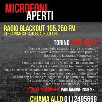 I concerti dal vivo dal laid studio della blackot house in diretta streaming e sul canale youtube RadioBlackoutTorino ( https://www.youtube.com/channel/UCREnsWtna69pWW8jOvKwV_w ).