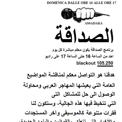 Assadaka ~ Amiciziaogni domenica dalle 14:00 alle 17:00Il programma ‘Assadaka ~ Amicizia’ sarà con voi in diretta ogni domenica dalle 15.00 alle 17 00 sulle libere frequenze di radio blackout 105.250 Il nostro obiettivo è quello di comunicare con il pubblico per discutere i temi generali degli immigrati arabi per cercare di raggiungere insieme una soluzione ai problemi. Durante la trasmissione tra […]